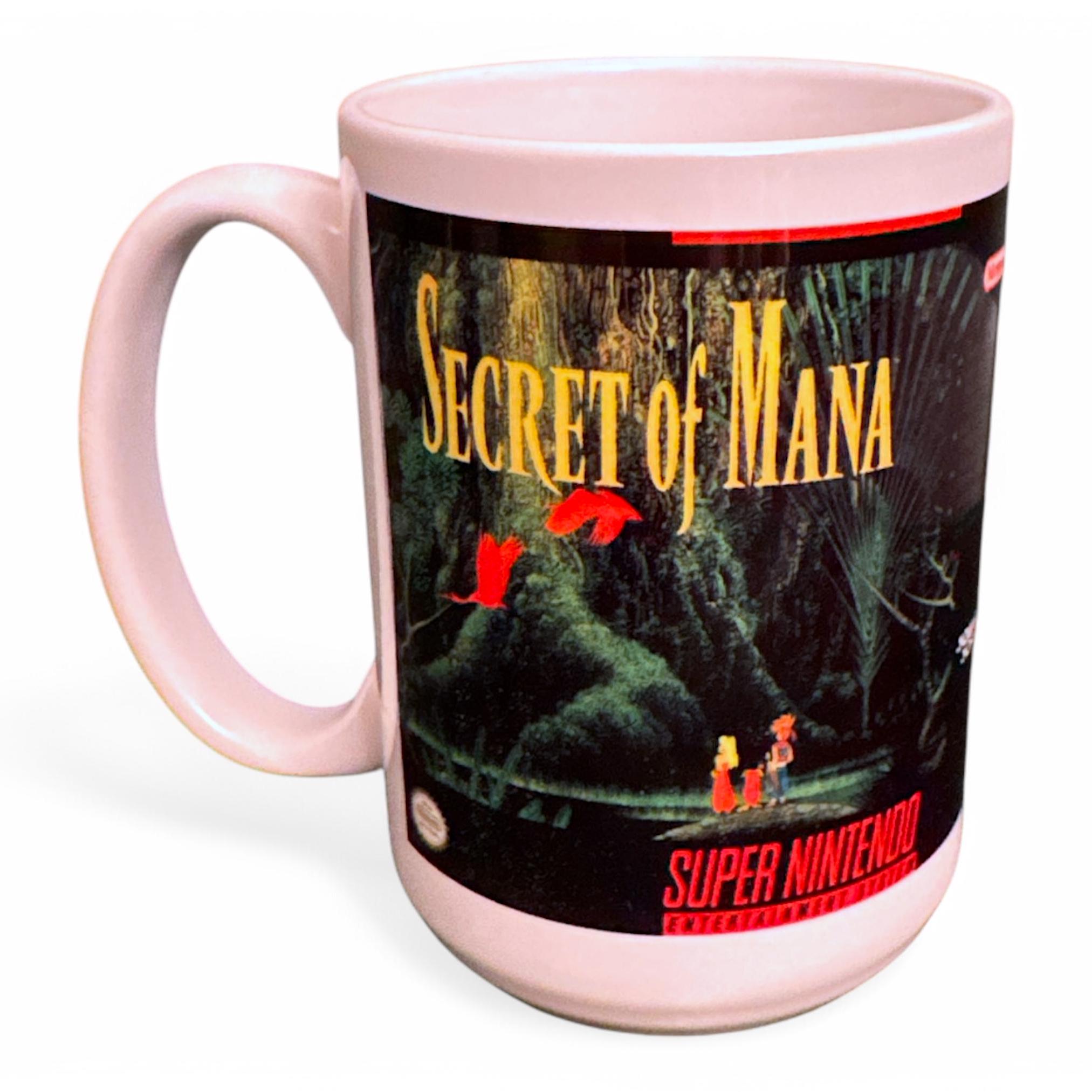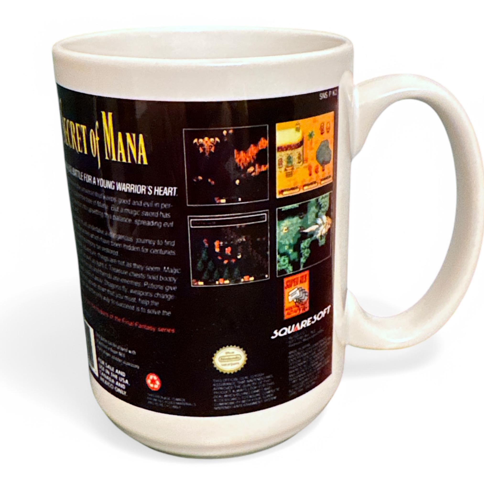 Return to the lush world of Mana with every sip! This 15 oz ceramic mug features the iconic box art from Secret of Mana, one of the most beloved RPGs of the SNES era. The design showcases the game's stunning forest backdrop with vibrant greenery and the legendary Mana Tree, bringing the nostalgia of this classic adventure straight to your coffee routine. The back of the mug faithfully replicates the original SNES box details, including screenshots and the classic game description, making this a must-have collectible for retro gaming fans.