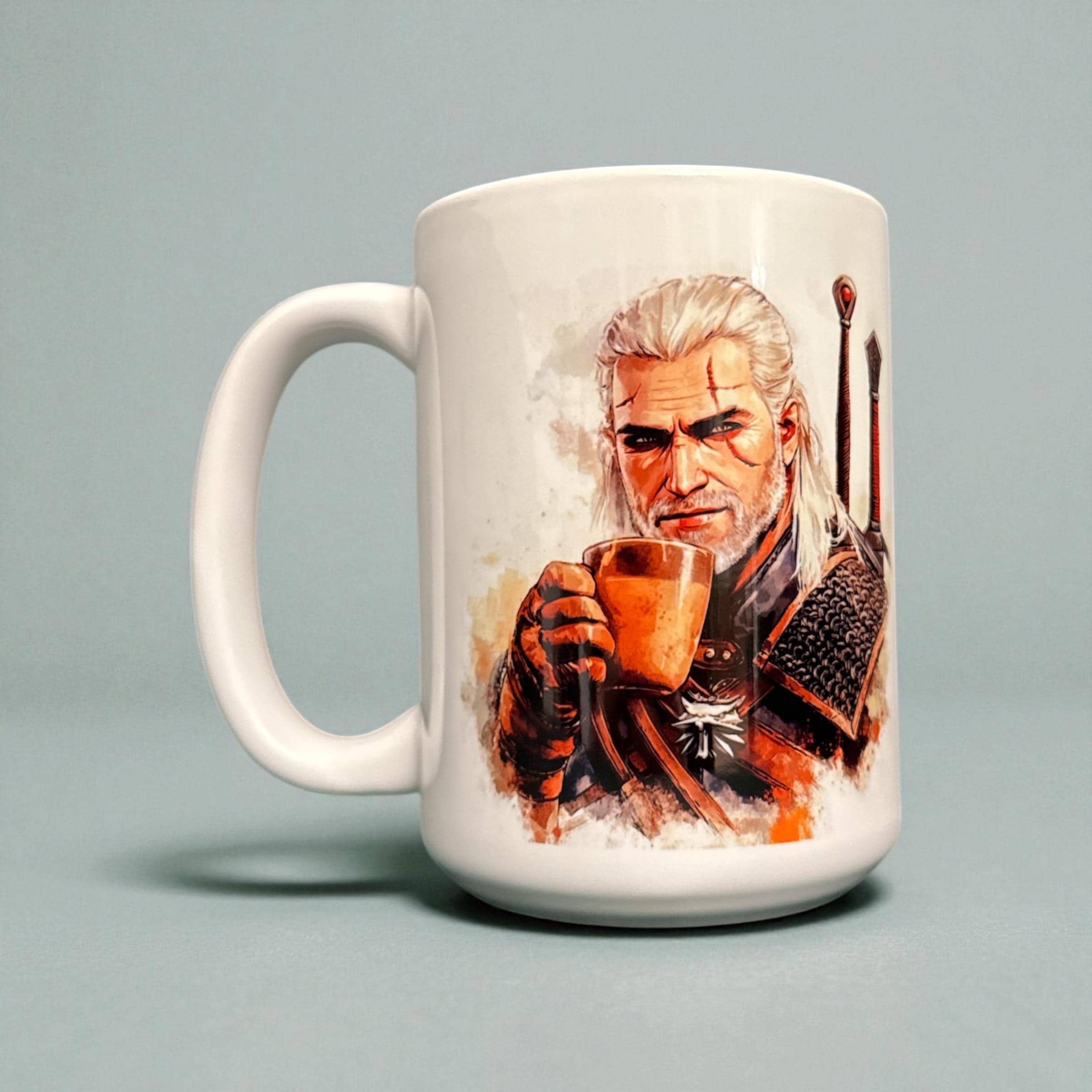 Step into the world of The Witcher with this stunning watercolor-inspired coffee mug featuring Geralt of Rivia. Whether you're sipping Kaer Morhen-style herbal tea, morning coffee, or a celebratory drink after a tough contract, this 15 oz high-quality ceramic mug is the perfect companion for any Witcher fan. Featuring a beautifully detailed watercolor design, this artistic tribute to Geralt is a must-have for collectors, gamers, and fantasy lovers alike.