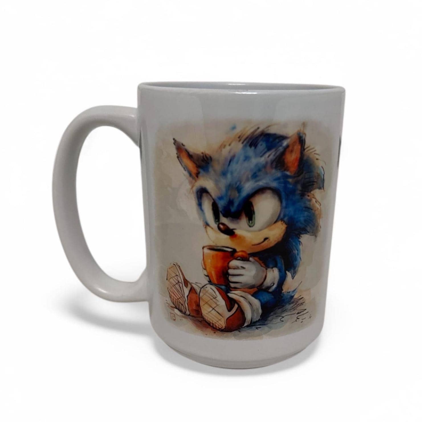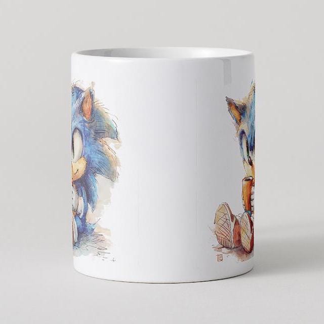 Speed into your morning with a boost from Sonic! This 15 oz ceramic coffee mug features a watercolor-style design inspired by the iconic Sonic the Hedgehog, sitting down with a cozy cup of coffee. With vibrant colors and an adorable, hand-painted look, this mug is perfect for Sonic fans, retro gamers, and collectors.