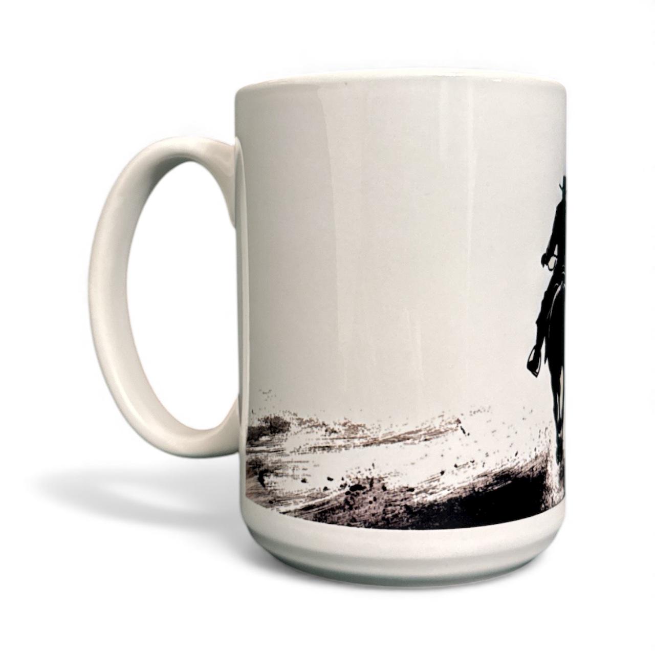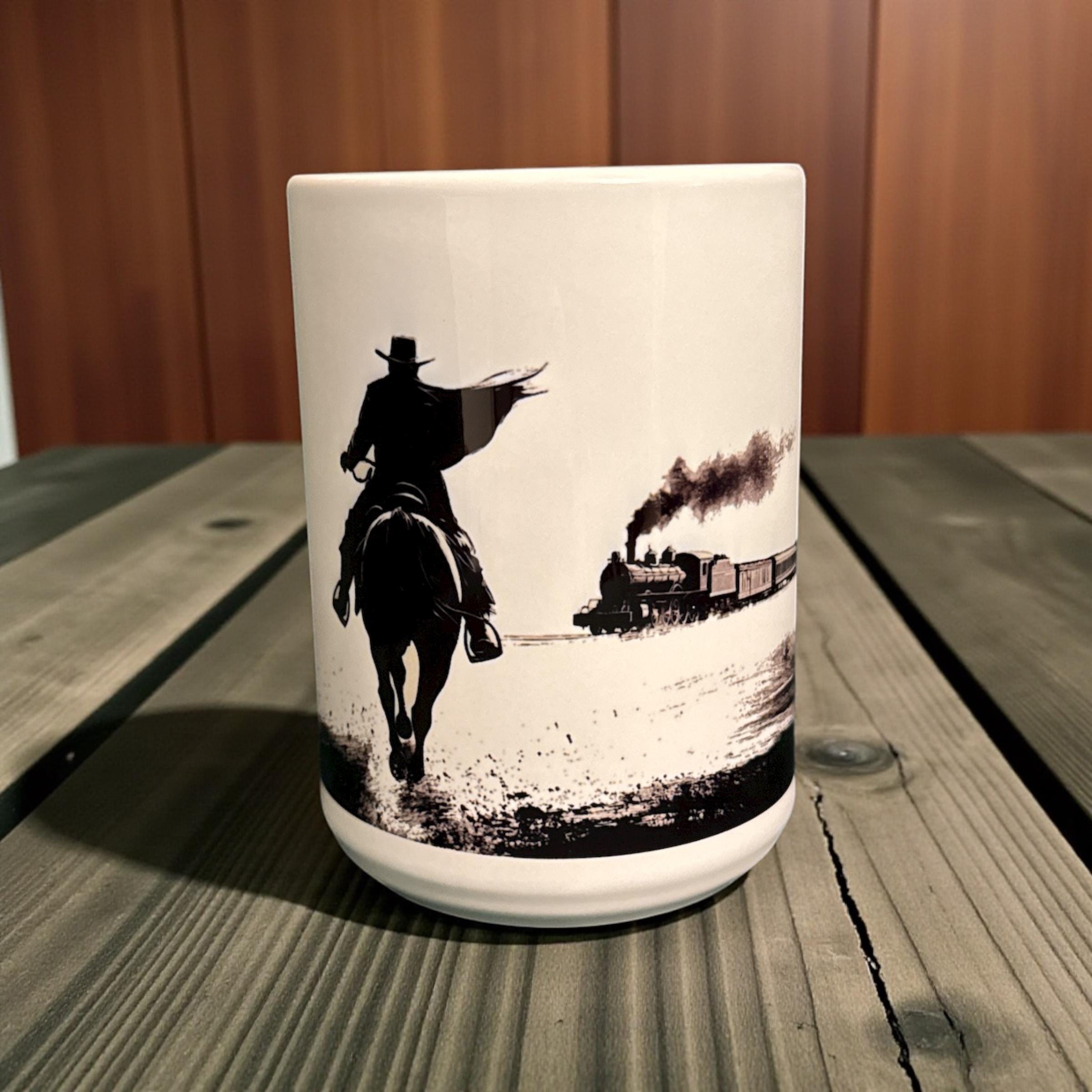 This Red Dead Redemption-inspired coffee mug captures the essence of the Wild West, featuring an Arthur Morgan inspired cowboy in a stunning black-and-white ink-style design, galloping toward a train in true outlaw fashion. Whether you're brewing your morning coffee before heading out on your own adventure or looking for a bold and stylish gaming mug, this Western-themed drinkware is a must-have for any fan of the game.