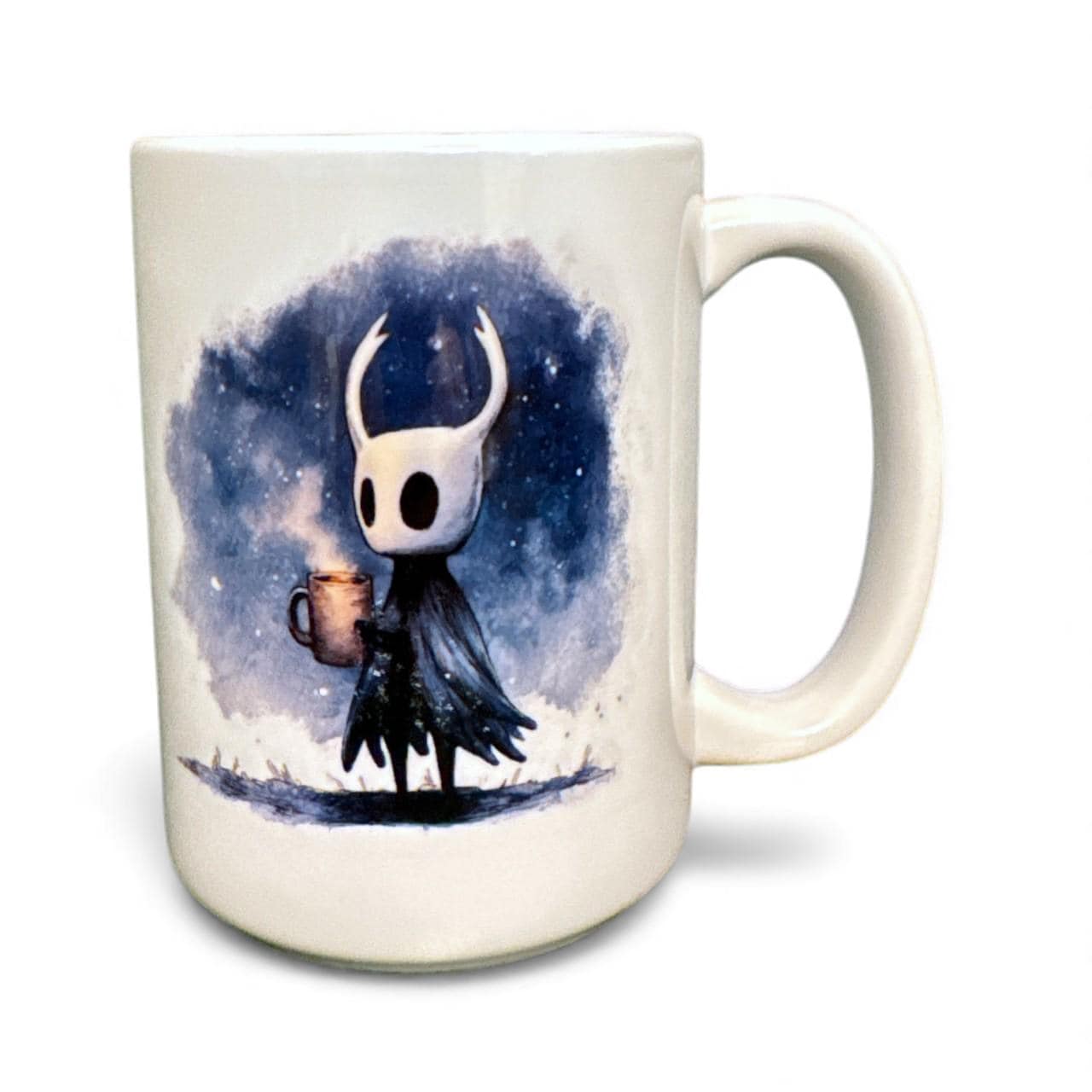 Quiet nights in Hallownest pair well with a warm drink. This Hollow Knight-inspired watercolor mug features The Knight rendered in a dreamy blue wash on a glossy white 15 oz ceramic mug. Soft textures, crisp linework, and a cozy vibe make it a standout piece for indie game fans who love thoughtful art on everyday drinkware.