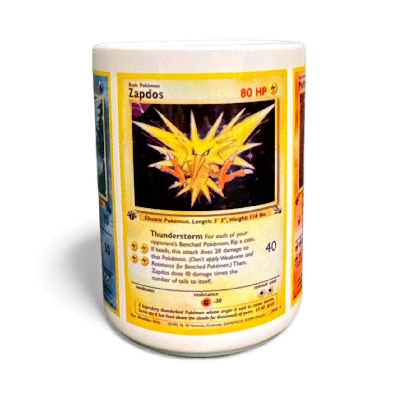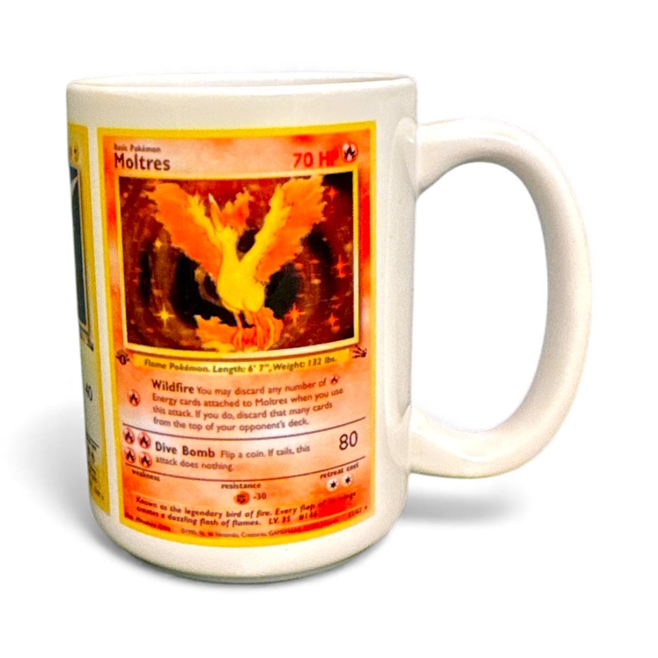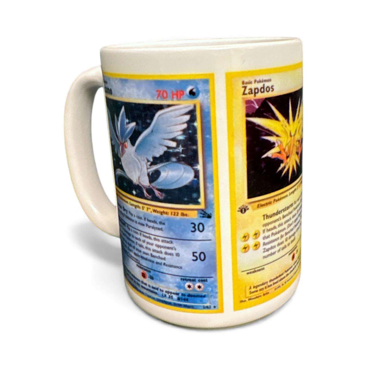 Binder-page nostalgia, now in wrap form. This Legendary Birds card trio mug features Articuno, Zapdos, and Moltres from the classic Fossil set, arranged as a full wrap across a glossy white 15 oz ceramic mug. Clean spacing and true card proportions keep the vintage WOTC-era look intact—perfect for trainers who remember opening packs and chasing holos.