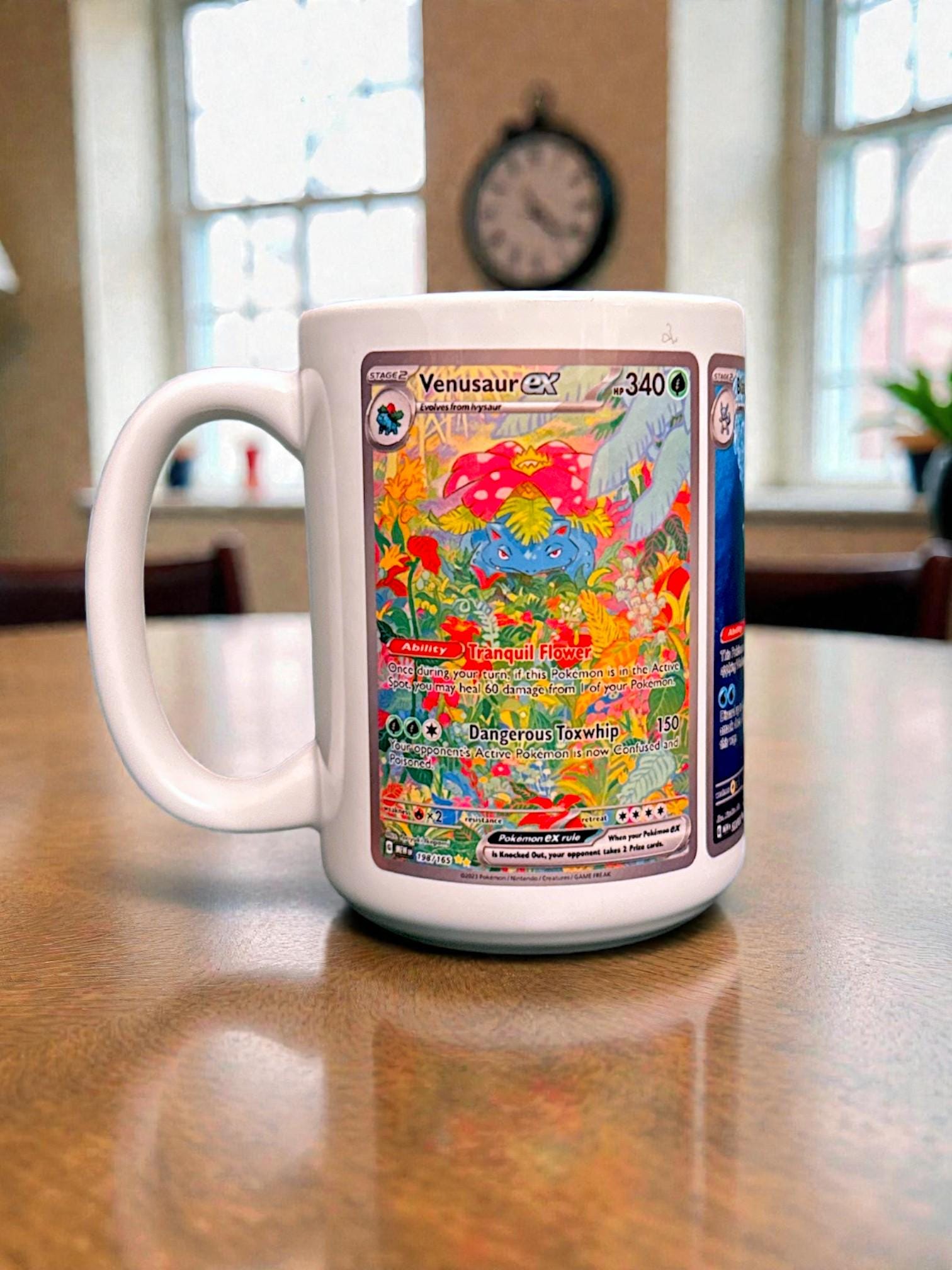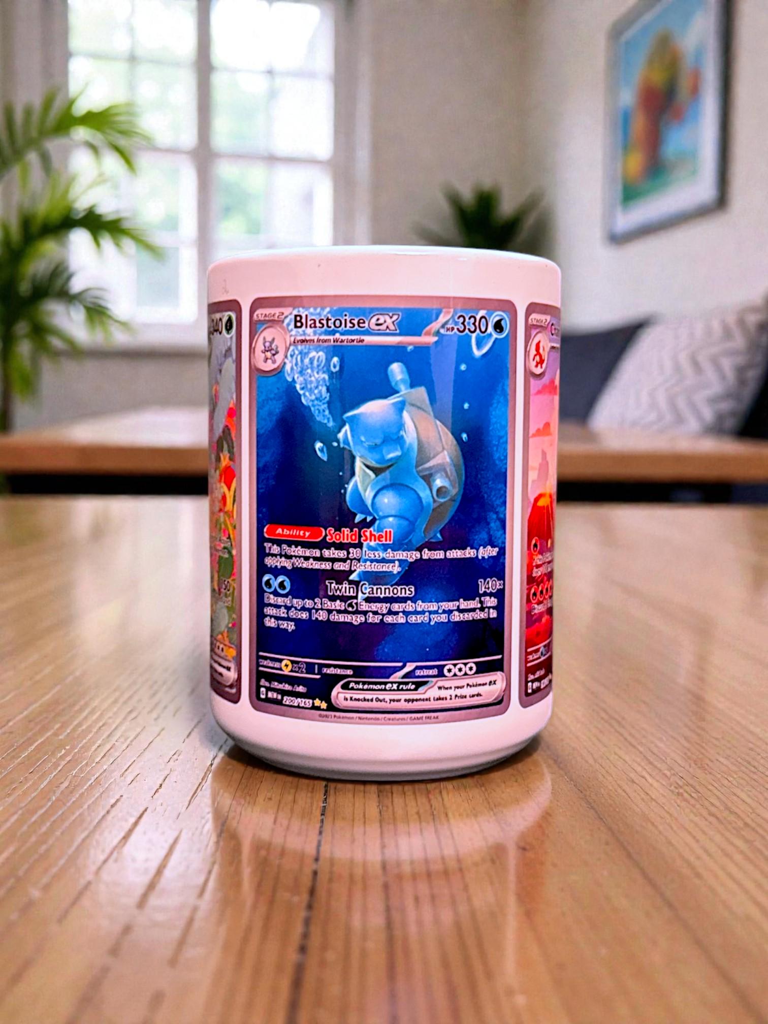 Binder-page nostalgia, brewed fresh. This starter trio card wrap mug features Charizard, Venusaur, and Blastoise from Pokémon 151, arranged as a full wrap across a glossy white 15 oz ceramic mug. True-to-card proportions, clean spacing, and crisp detail make this a display-ready piece for anyone who still knows their way from Pallet Town to the Indigo Plateau.