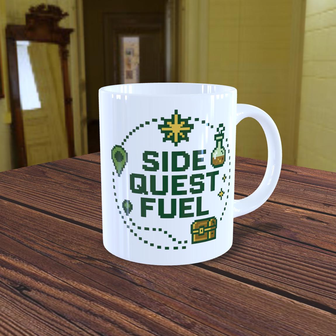 Power up before you stray off the main path. This “Side Quest Fuel” mug features a clean pixel-art crest—map pins, potion, compass star, and treasure chest—printed crisp on a glossy white 15 oz ceramic mug. It’s a daily nod to RPGs, perfect for gamers who love exploration, crafting runs, and “just one more objective.”
