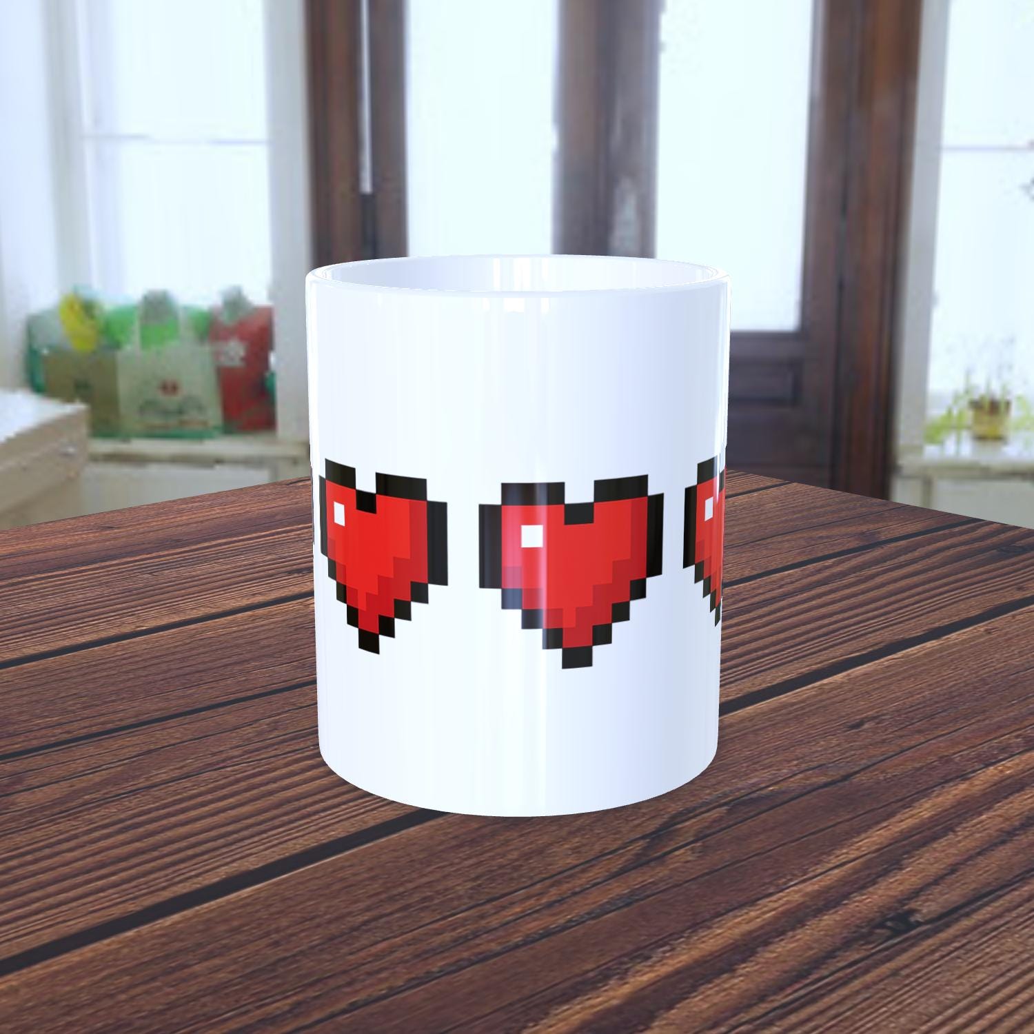 Layout & Design Full wrap: repeating red pixel hearts with crisp black outlines Balanced spacing so the pattern reads clearly from any angle Minimal white background so the hearts pop in photos and on shelf
