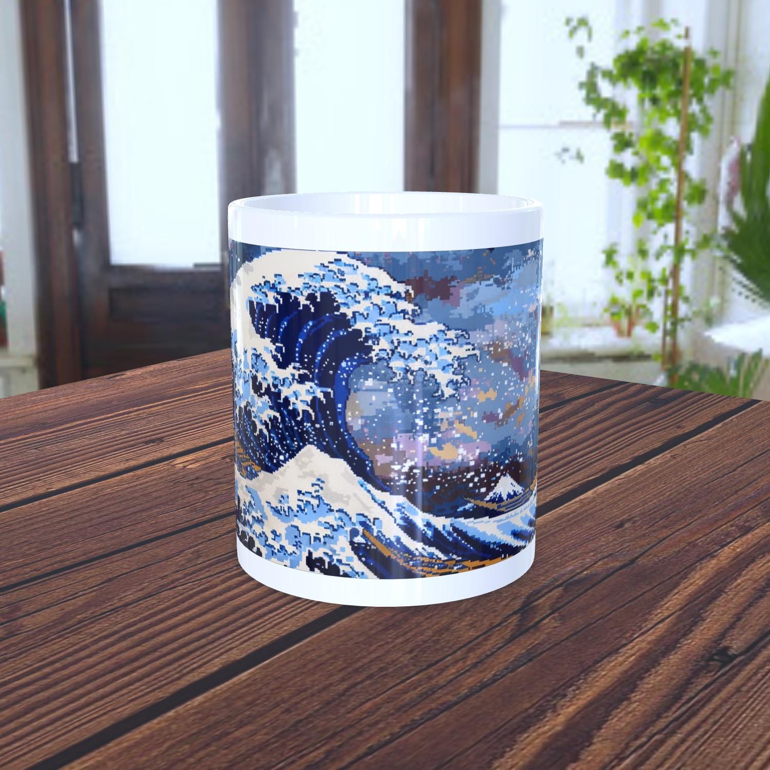 Arcade pixels meet classic printmaking. This mug wraps a video game–style pixel rendition of “The Great Wave” all the way around a glossy white 15 oz ceramic. Deep ocean blues, foamy highlights, and crisp blocky details make it pop on a desk, stream background, or bookshelf—perfect for fans of retro gaming and art-inspired décor.