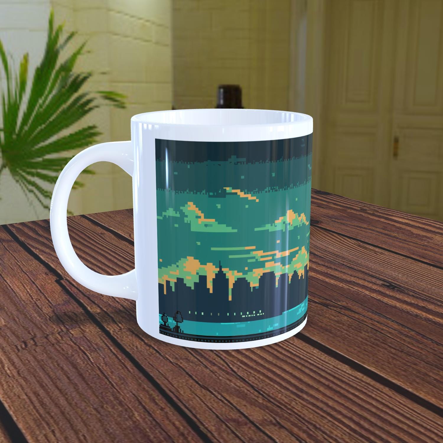 Bring a slice of New York to your desk. This Statue of Liberty pixel art mug wraps a retro 8-bit NYC skyline—teal dusk sky, glowing torch, and city lights—around a 15 oz ceramic mug. Crisp blocks, high contrast, and a full-wrap layout make an eye-catching video game–inspired cityscape for your morning coffee.