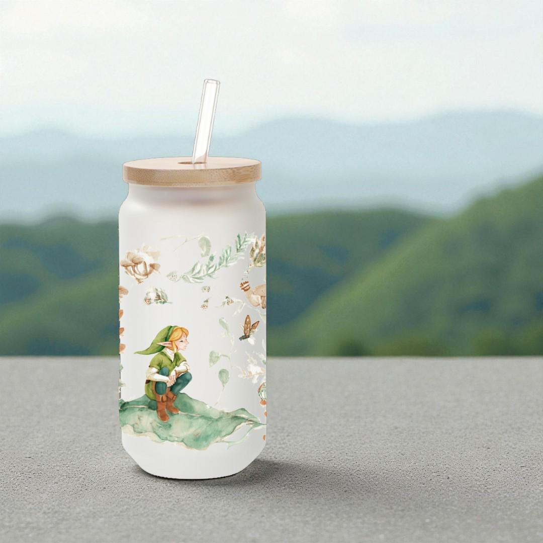 Cottagecore meets questing. This 18 oz (550 ml) frosted glass can pairs a natural bamboo lid and reusable straw with a dreamy botanical watercolor wrap—ferns, mushrooms, and a green-clad hero in the wild. The soft matte frost makes the art pop and photographs beautifully for desks, coffee bars, or streamer setups.