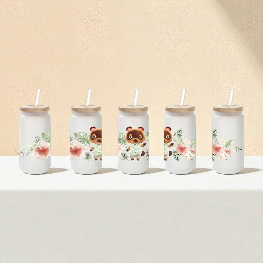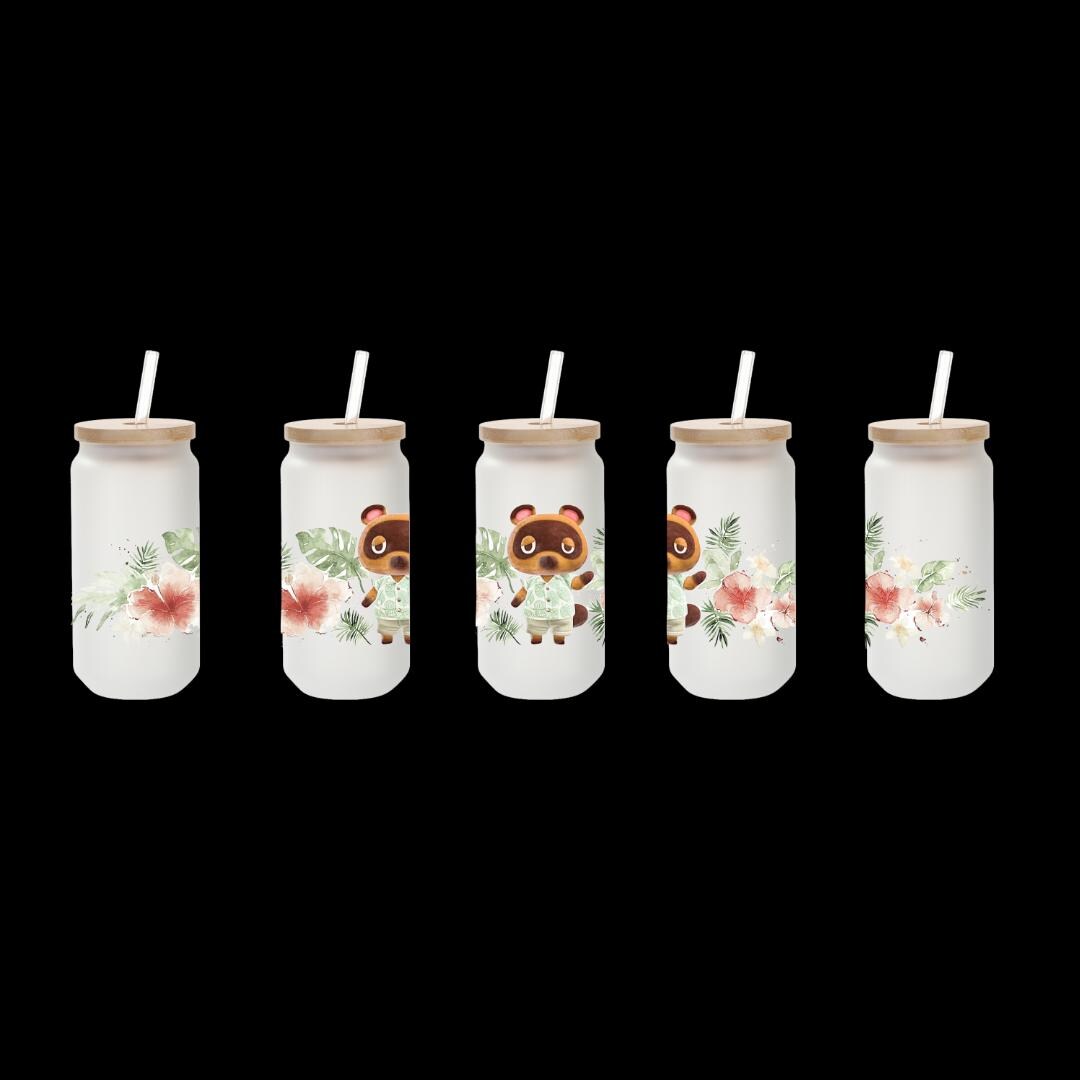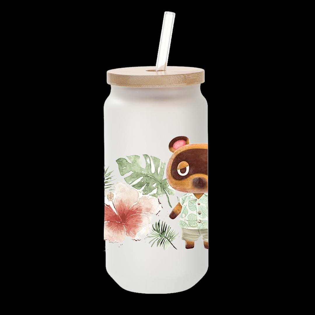 Cozy island café vibes in a cup. This 18 oz (550 ml) frosted glass can features a Tom Nook–inspired botanical watercolor wrap—palm leaves, soft florals, and a matte frost that makes the art glow. Finished with a bamboo lid and reusable straw, it’s an aesthetic iced-coffee glass for your desk, kitchen, or game room.