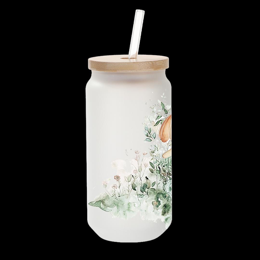 Details Capacity: 18 oz / 550 ml Material: Frosted glass with fade-resistant full-wrap print Lid/Straw: Bamboo lid + reusable straw (café feel, eco-friendly) Shape: Beer-can style; cup-holder friendly